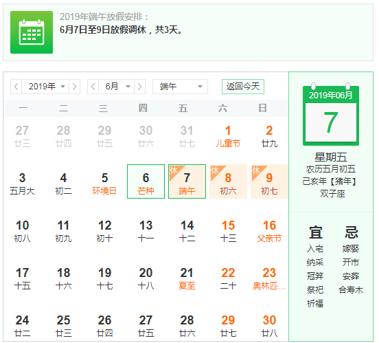 端午節(jié)假期將至,首先向全體員工致以節(jié)日的問候,為了度過歡樂、祥和、平安的節(jié)日,2019年端午節(jié)的放假時間:2019年6月7日至6月9日放假公休,共3天。6月7日(星期五,農(nóng)歷端午節(jié)當(dāng)日)為國家法定節(jié)假日,6月8日(星期六)公休,6月9日(星期日)補(bǔ)休。